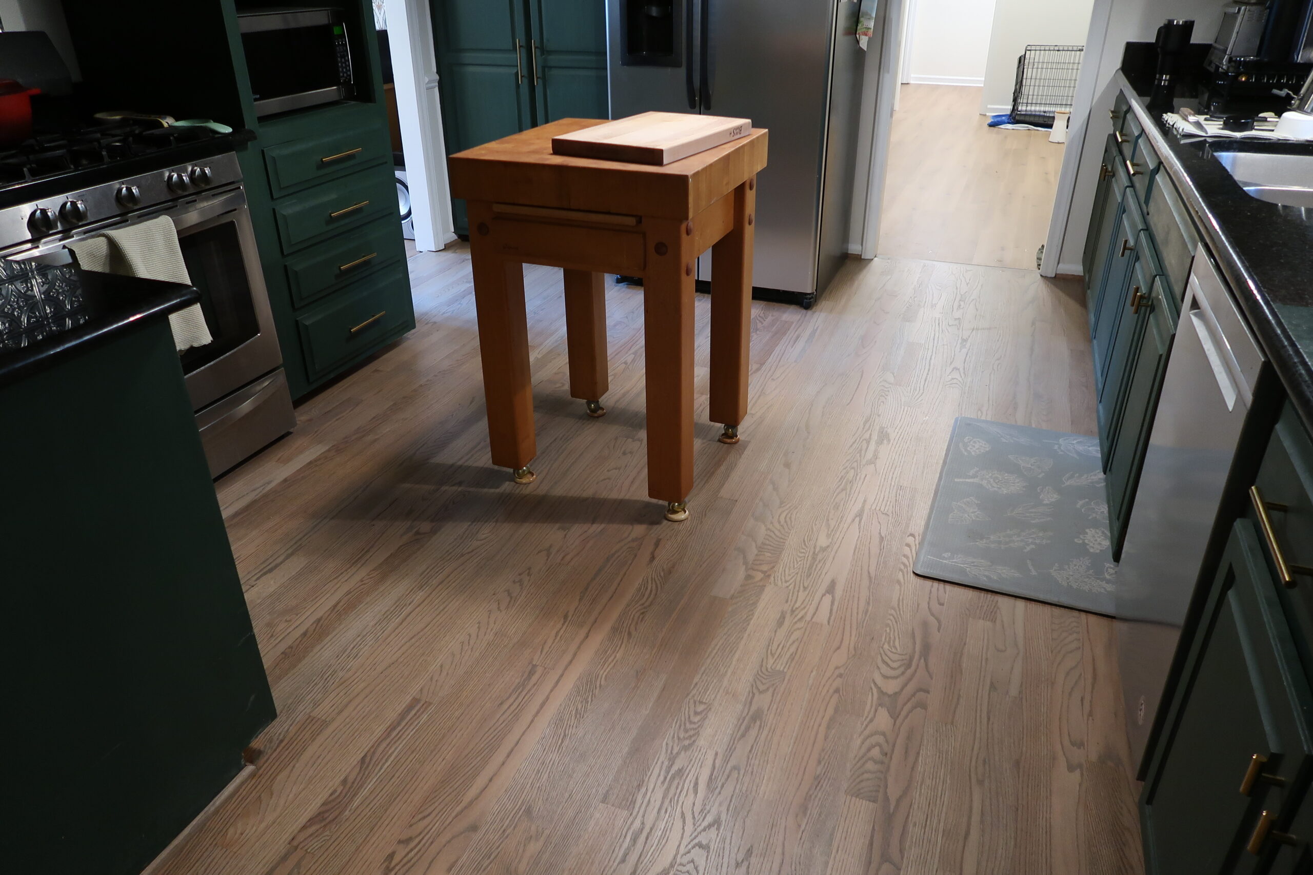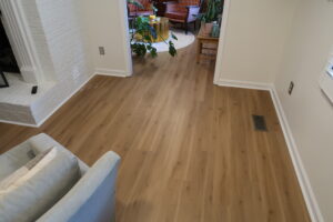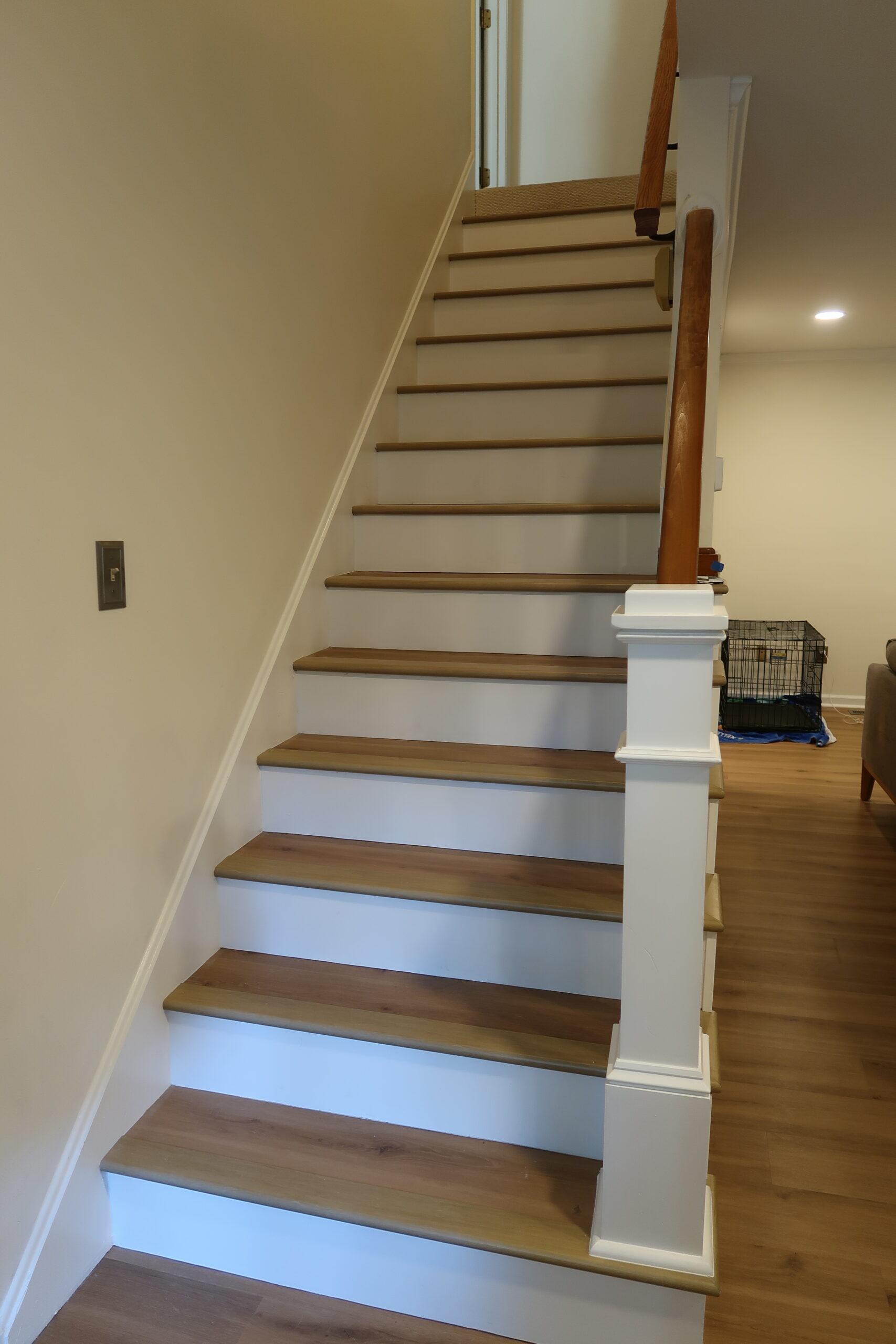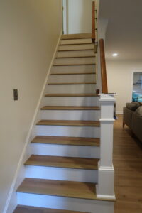 The stairs were not left untouched. Matching treads were installed to harmonize with the luxury vinyl plank flooring, creating a seamless and sophisticated transition between the first and second floors.