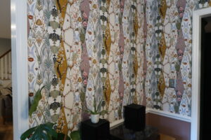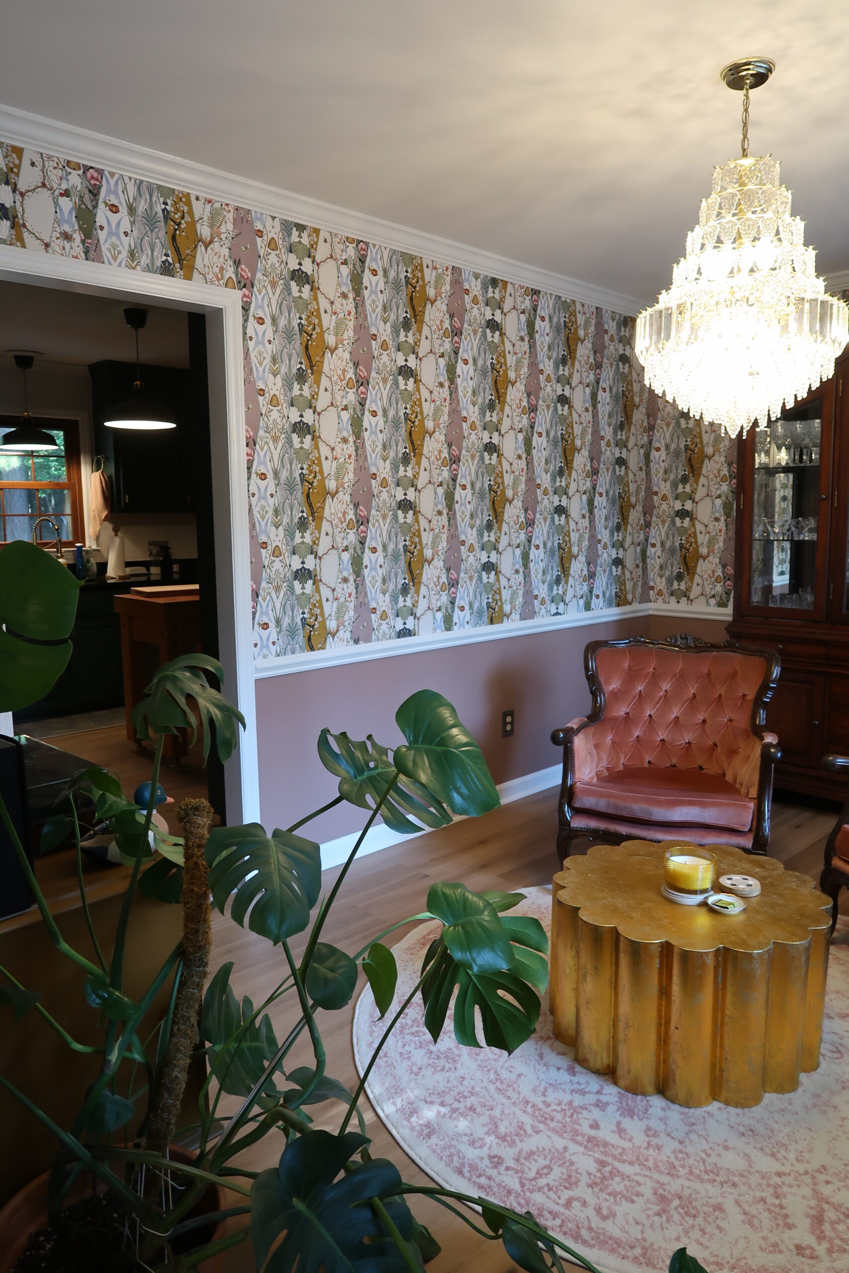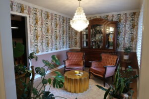 In a creative twist, we converted the formal dining room into a cozy keeping room. Custom wallpaper now adorns the walls, and an elegant chandelier now graces the space, turning it into a perfect spot for relaxation and gatherings.