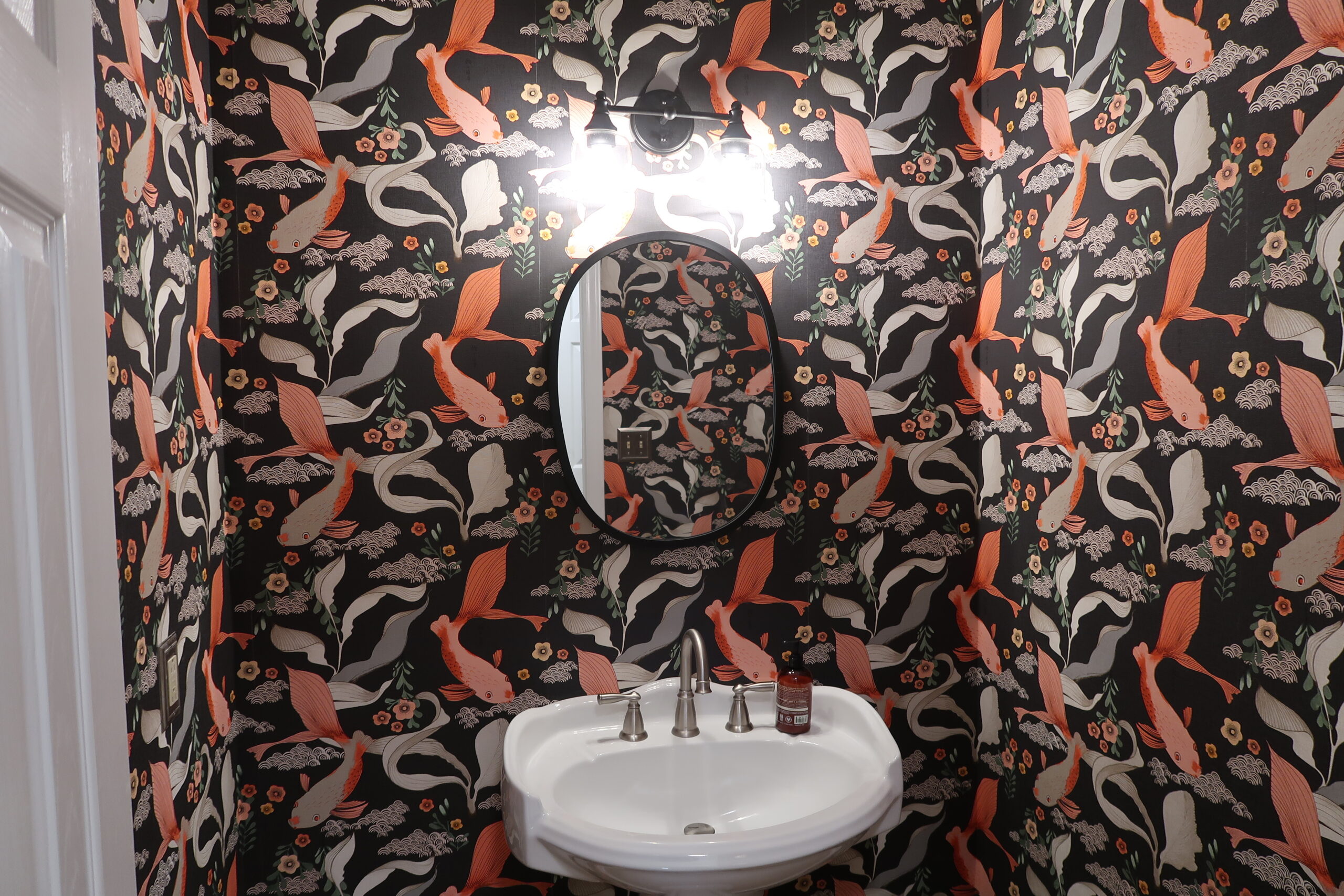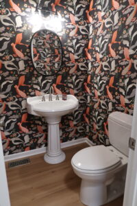 The powder room received a chic makeover with custom wallpaper, a new toilet, and updated fixtures. The small space is now a stylish retreat with modern amenities.